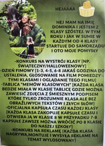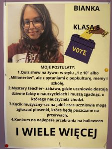 Nasi uczniowie nie będą mieli łatwego zadania – kandydaci wspięli się na wyżyny pomysłowości i przedstawili naprawdę ciekawe propozycje, które chcieliby zrealizować w naszej szkole.