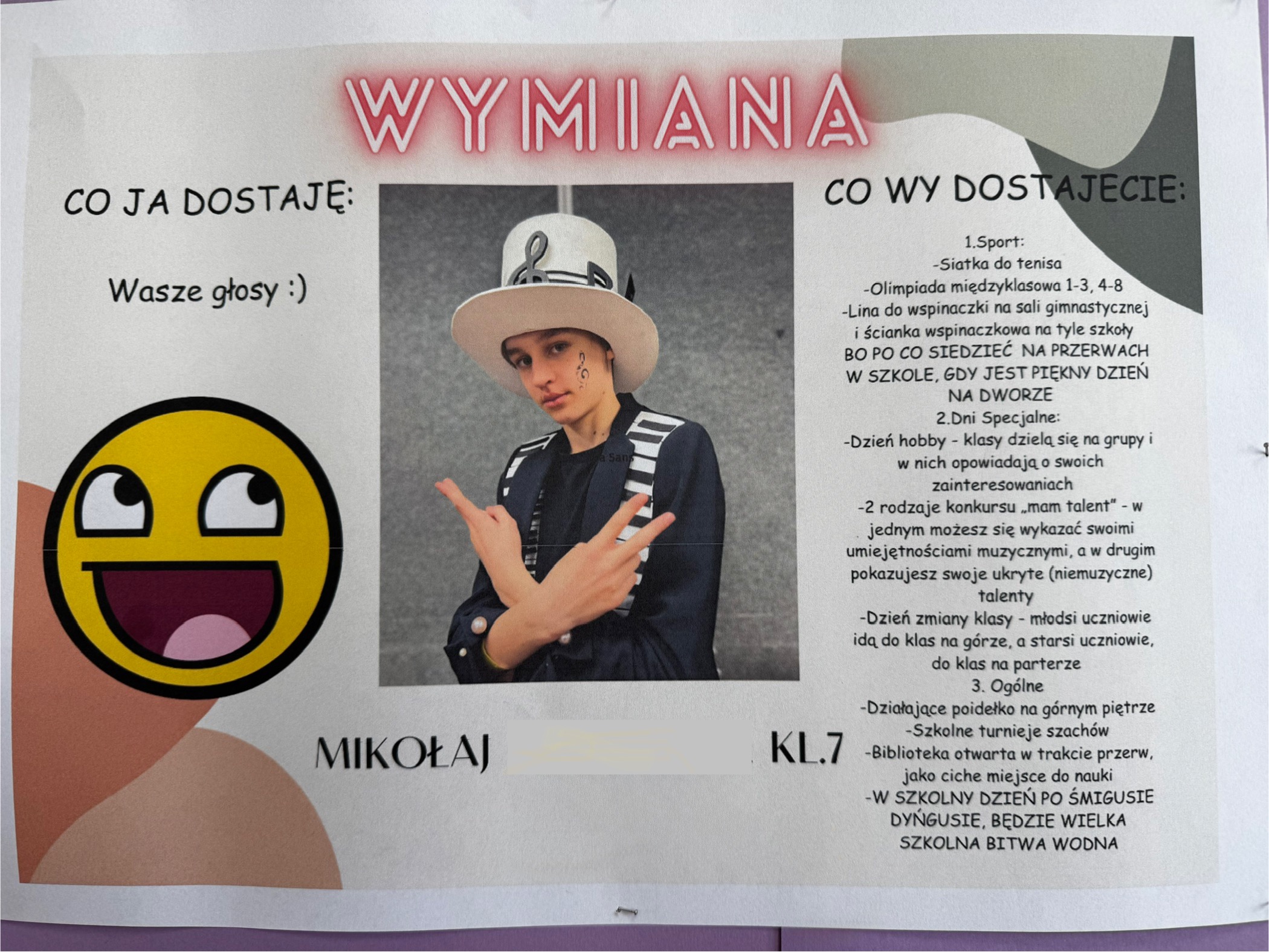 Nasi uczniowie nie będą mieli łatwego zadania – kandydaci wspięli się na wyżyny pomysłowości i przedstawili naprawdę ciekawe propozycje, które chcieliby zrealizować w naszej szkole.