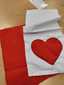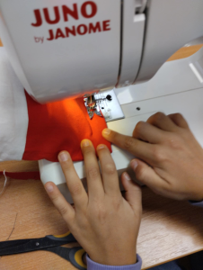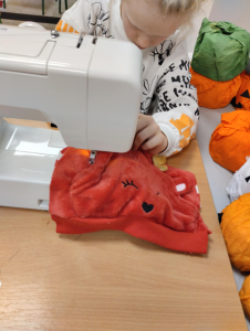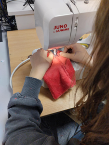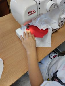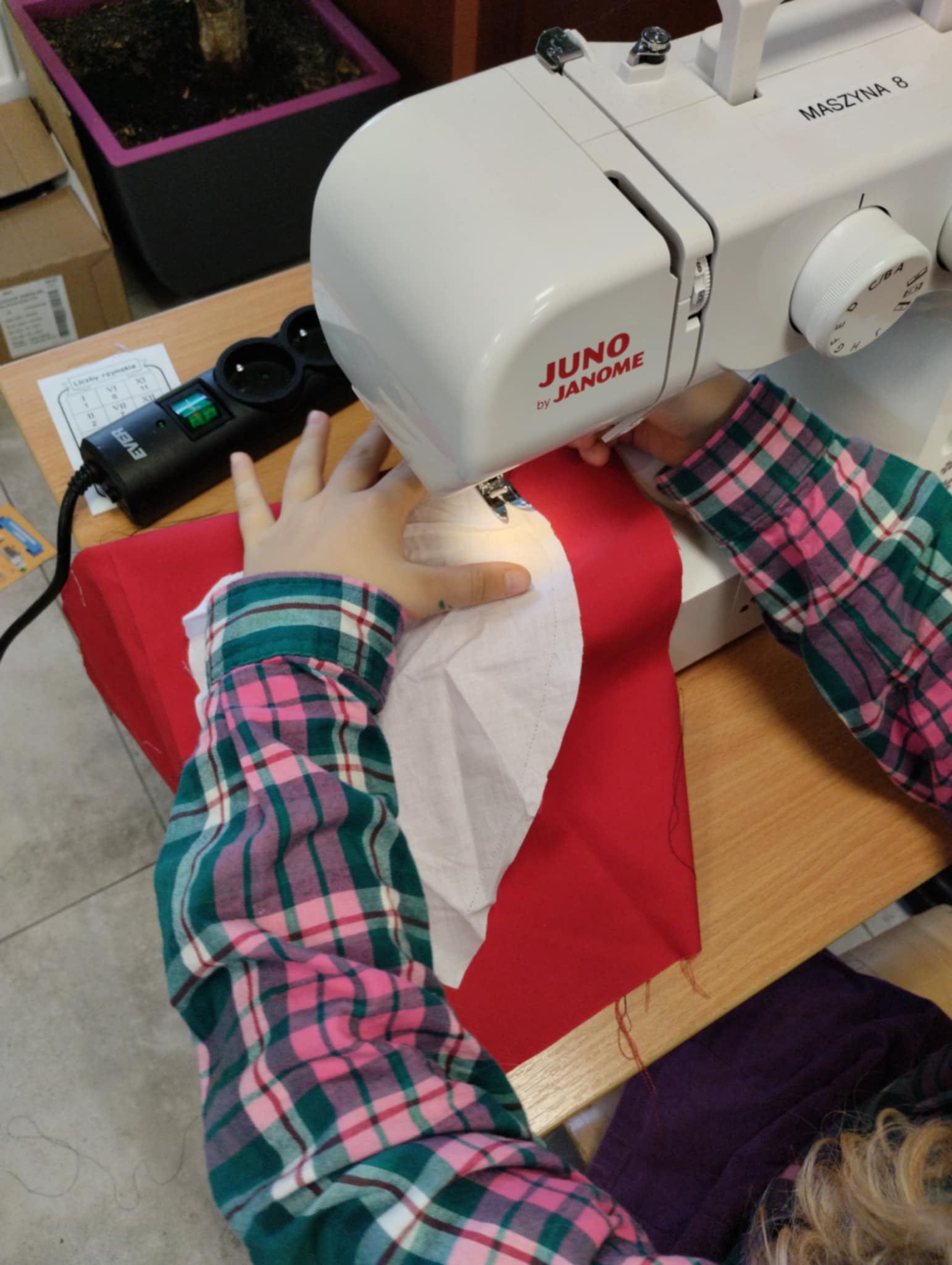 Na kółku szycia maszynowego uczestnicy szykują się do Święta Niepodległości.
